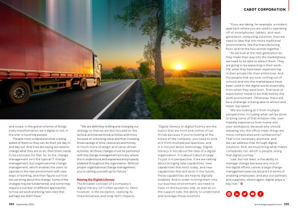 “ Digital literacy or digital fluency are the topics that are front and centre of our minds because if you ' re looking at the future of the company , you need to look at it from multiple perspectives , and it is not just about technology . Digital literacy is not about the idea of a digital organisation . It is about Cabot at large . To put it in perspective , if we are talking about bringing new capabilities , new capabilities that exist today , and new capabilities that will exist in the future , those capabilities are heavily digitally enabled . And in order to bring them into our business environment , we need to have on the business side , as well as on the support side , the ability to understand and leverage those solutions .