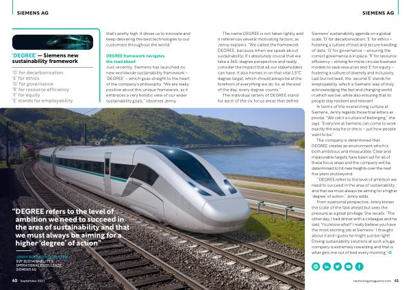 DEGREE framework navigates the road ahead Just recently , Siemens has launched its new worldwide sustainability framework – ‘ DEGREE ’ – which goes straight to the heart of the company ’ s philosophy . “ We are really positive about this unique framework , as it embraces a very holistic view of our wider sustainability goals ,” observes Jenny .