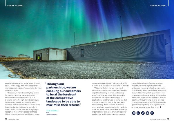 “ At Verne Global , we are very much positioned for the future . We are certainly capable of looking forward and seeing what ' s coming ; we know that we ' re able to cater for the higher density end of applications and the type of compute that is going to support that in the hardware that ' s coming down the line . But we ' re also − perhaps more importantly − able to cater for those other two major challenges organisations face . One of which is power availability , and Iceland has this massive natural abundance of power , the vast majority of which arguably remains untapped , meaning it has huge amounts of scalability and is sustainable . And lastly , the world is finally starting to realise the importance of sustainability . We stand in a fantastic position , and frankly , a unique position , through being able to provide our customers with that 100 % renewable generation capability that organisations are now seeking more than ever .”