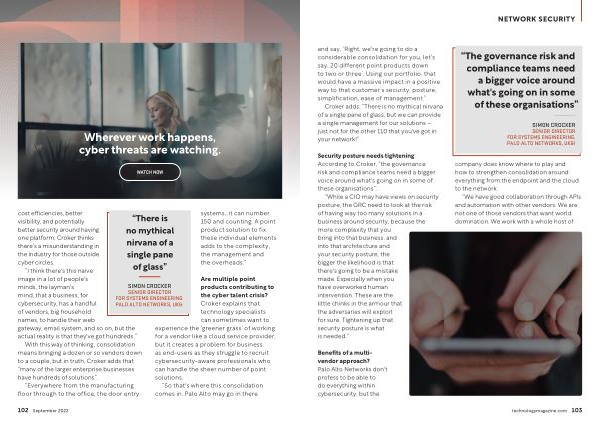 SIMON CROCKER SENIOR DIRECTOR FOR SYSTEMS ENGINEERING , PALO ALTO NETWORKS , UK & I systems … it can number 150 and counting . A point product solution to fix these individual elements adds to the complexity , the management and the overheads .”
