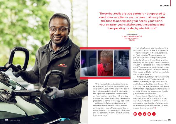 ANTHONY FOUST GLOBAL CHIEF INFORMATION SECURITY OFFICER , BELRON “ This has really been the big difference between just a typical transaction with an endpoint solution . At the end of the day , the technology speaks for itself . It has made a real significant impact and the noise that our team are having to deal with on a dayto-day basis has reduced . They have been a great partner from a technology side point .”