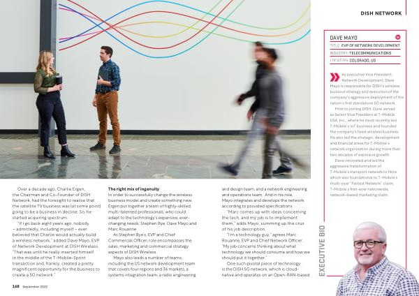 The right mix of ingenuity In order to successfully change the wireless business model and create something new , Ergen put together a team of highly-skilled , multi-talented professionals , who could adapt to the technology ’ s expansive , everchanging needs : Stephen Bye , Dave Mayo and Marc Rouanne .