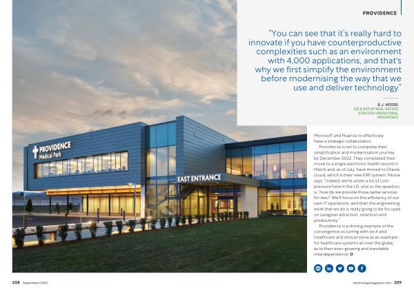 Providence is set to complete their simplification and modernisation journey by December 2022 . They completed their move to a single electronic health record in March and , as of July , have moved to Oracle cloud , which is their new ERP system . Moore says : “ Indeed , we ’ re under a lot of costpressure here in the US , and so the question is , ‘ how do we provide those same services for less ?’ We ’ ll focus on the efficiency of our own IT operations , and then the engineering work that we do is really going to be focused on caregiver attraction , retention and productivity .”