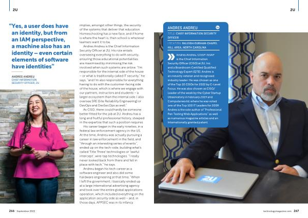 Andres Andreu , CISSP-ISSAP is the Chief Information Security Officer ( CISO ) at 2U , Inc . and a Boardroom Certified Qualified Technology Expert ( QTE ). Andres is an industry veteran and recognised industry leader . He was chosen as one of the Top 10 CISOs for 2022 by C-Level Focus . He was also chosen as CISO / Leader of the week by the Cyber Startup Observatory in February 2019 and Computerworld , where he was voted one of the Top 100 IT Leaders for 2009 . Andres is the sole author of “ Professional Pen Testing Web Applications ” as well as numerous magazine articles and an Internationally granted patent . technologymagazine . com 267