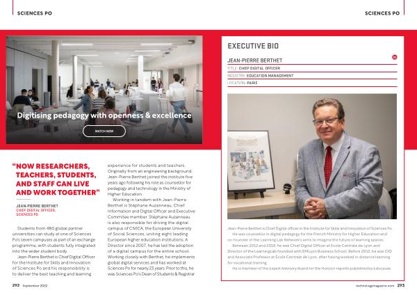 Jean-Pierre Berthet is Chief Digital officer in the Institute for Skills and Innovation of Sciences Po . He was counsellor in digital pedagogy for the French Ministry for Higher Education and co-founder of the Learning Lab Network ' s aims to imagine the future of learning spaces .