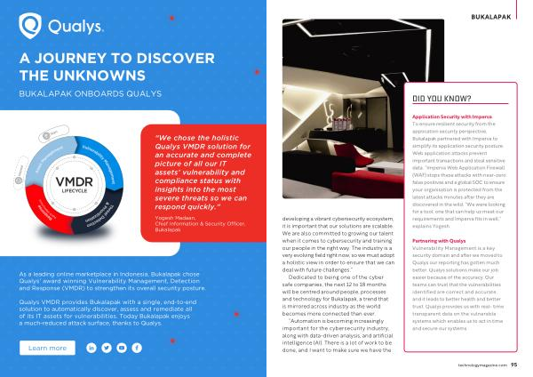 Partnering with Qualys Vulnerability Management is a key security domain and after we moved to Qualys our reporting has gotten much better . Qualys solutions make our job easier because of the accuracy . Our teams can trust that the vulnerabilities identified are correct and accurate , and it leads to better health and better trust . Qualys provides us with real- time transparent data on the vulnerable systems which enables us to act in time and secure our systems .