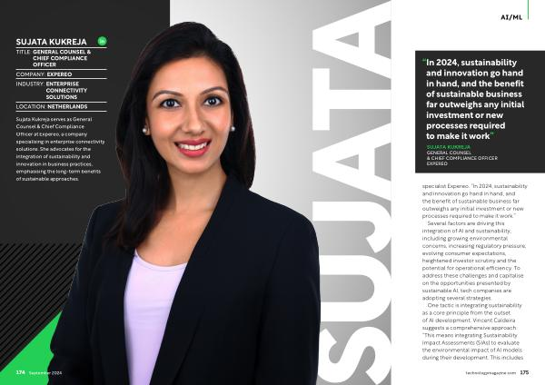 Sujata Kukreja serves as General Counsel & Chief Compliance Officer at Expereo , a company specialising in enterprise connectivity solutions . She advocates for the integration of sustainability and innovation in business practices , emphasising the long-term benefits of sustainable approaches .