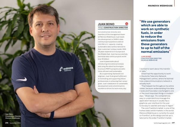 As Construction Director and member of the management team at Mainova WebHouse Juan leads the development of MWH ’ s data centre project pipeline to deliver 200 MW of IT capacity , creating sustainable data centres tailored to their customers ’ unique needs . With 20 years experience in Europe and the Middle East , Juan has successfully delivered data centre projects worth over € 1 billion .