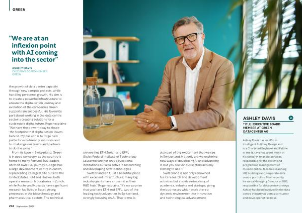 ASHLEY DAVIS TITLE : EXECUTIVE BOARD MEMBER AT GREEN DATACENTER AG also part of the excitement that we see in Switzerland . Not only are we exploring new ways of developing AI and advancing it , but you see various sectors actually starting to use it .”
