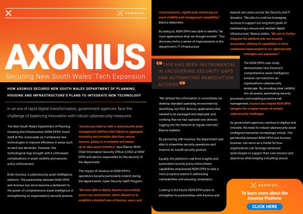 By partnering with Axonius , the department was partnership between NSW DPHI and Axonius , able to streamline security operations and however , can serve as a model for how organisations can leverage advanced improve its overall security posture . technologies to support their core mission and Equally , the platform ’ s real-time insights and objectives while keeping everything secure . automated security policy enforcement capabilities empowered NSW DPHI to take a more proactive stance in addressing vulnerabilities and ensuring compliance .