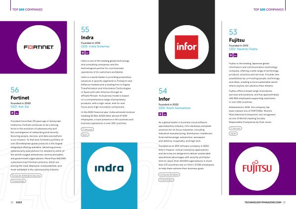 Indra is a world leader in providing proprietary solutions in specific segments in Transport and Defence markets and a leading firm in Digital Transformation and Information Technologies in Spain and Latin America through its affiliate Minsait. Its business model is based on a comprehensive range of proprietary products, with a high-value, end-to-end focus and a high innovation component. htps:/ www. fortinet. com htps:/ www. linkedin. com / company / fortinet /