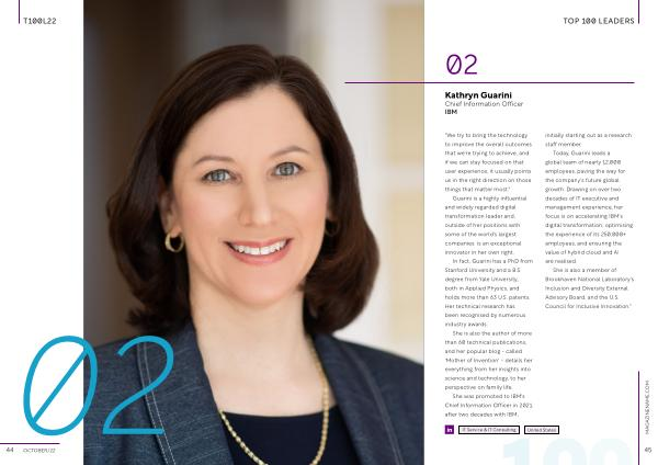 Chief Information Officer IBM " We try to bring the technology initially starting out as a research to improve the overall outcomes staff member . that we ' re trying to achieve , and Today , Guarini leads a if we can stay focused on that global team of nearly 12,000 user experience , it usually points employees , paving the way for us in the right direction on those the company ' s future global things that matter most ." growth . Drawing on over two Guarini is a highly influential decades of IT executive and and widely regarded digital management experience , her transformation leader and , focus is on accelerating IBM ' s outside of her positions with digital transformation , optimising some of the world ' s largest the experience of its 250,000 + companies , is an exceptional employees , and ensuring the innovator in her own right . value of hybrid cloud and AI In fact , Guarini has a PhD from are realised .